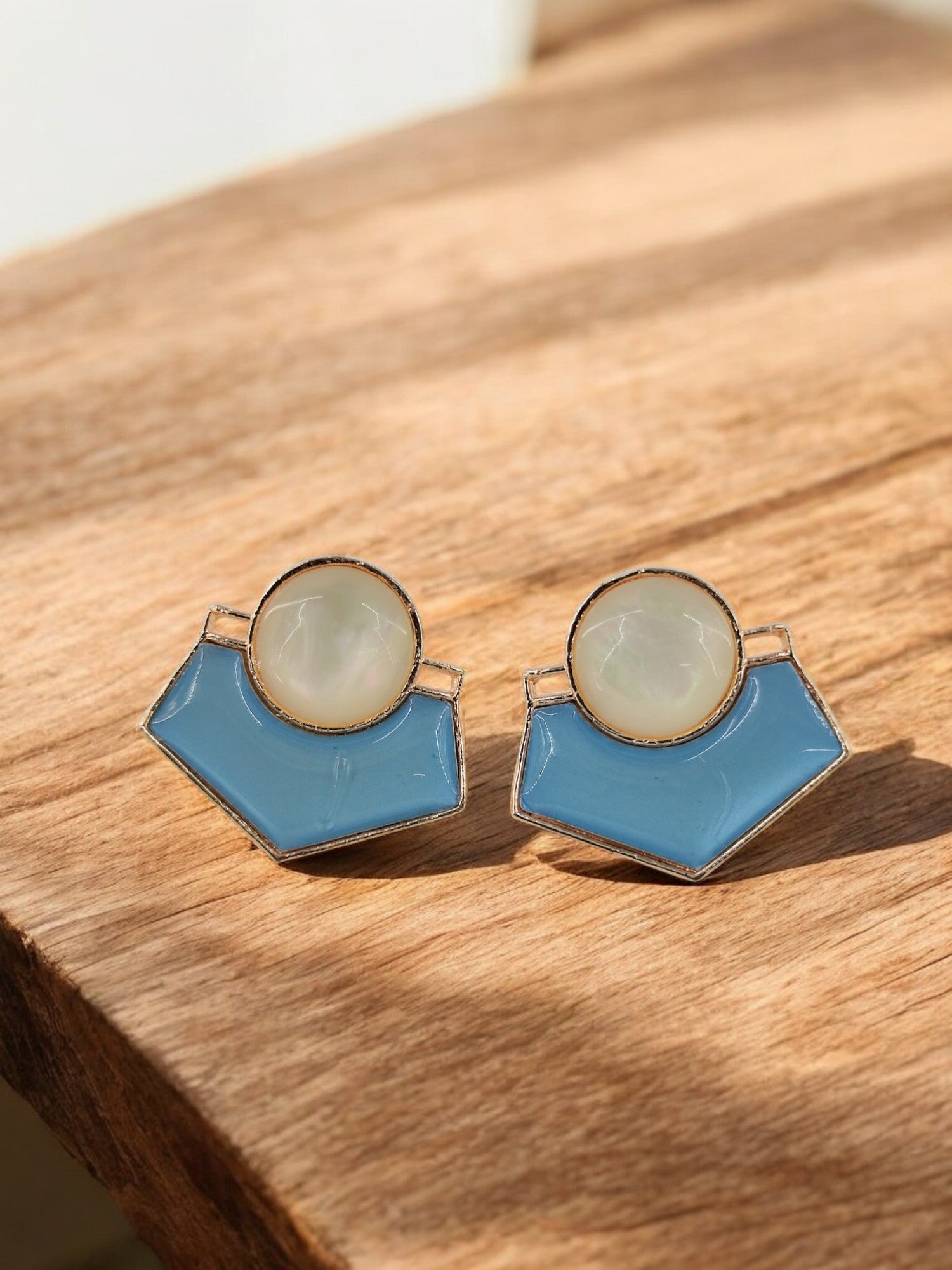 Let serenity meet style with our Aqua Bloom Studs. A calm sky-blue enamel base is elegantly paired with a glossy pearl-inspired dome, all encased in a golden frame. These earrings are a dreamy mix of minimalism and freshness — ideal for both casual and chic looks.