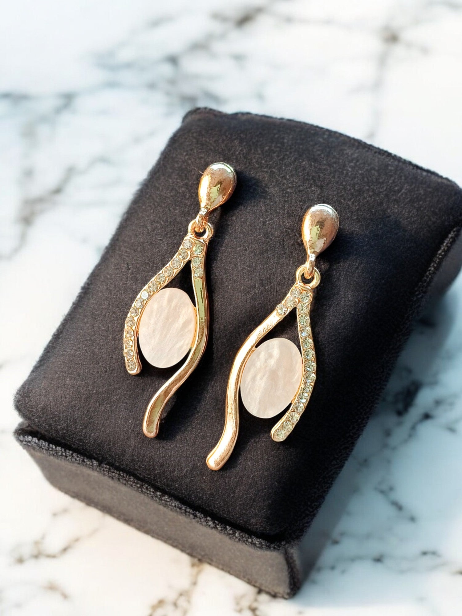 These flowing curve earrings are a true blend of elegance and sparkle. The sinuous lines hug a shimmering oval centerpiece, enhanced by a trail of crystal rhinestones. Whether in rose gold or white gold plating, these earrings bring a bold yet graceful touch to any outfit.
