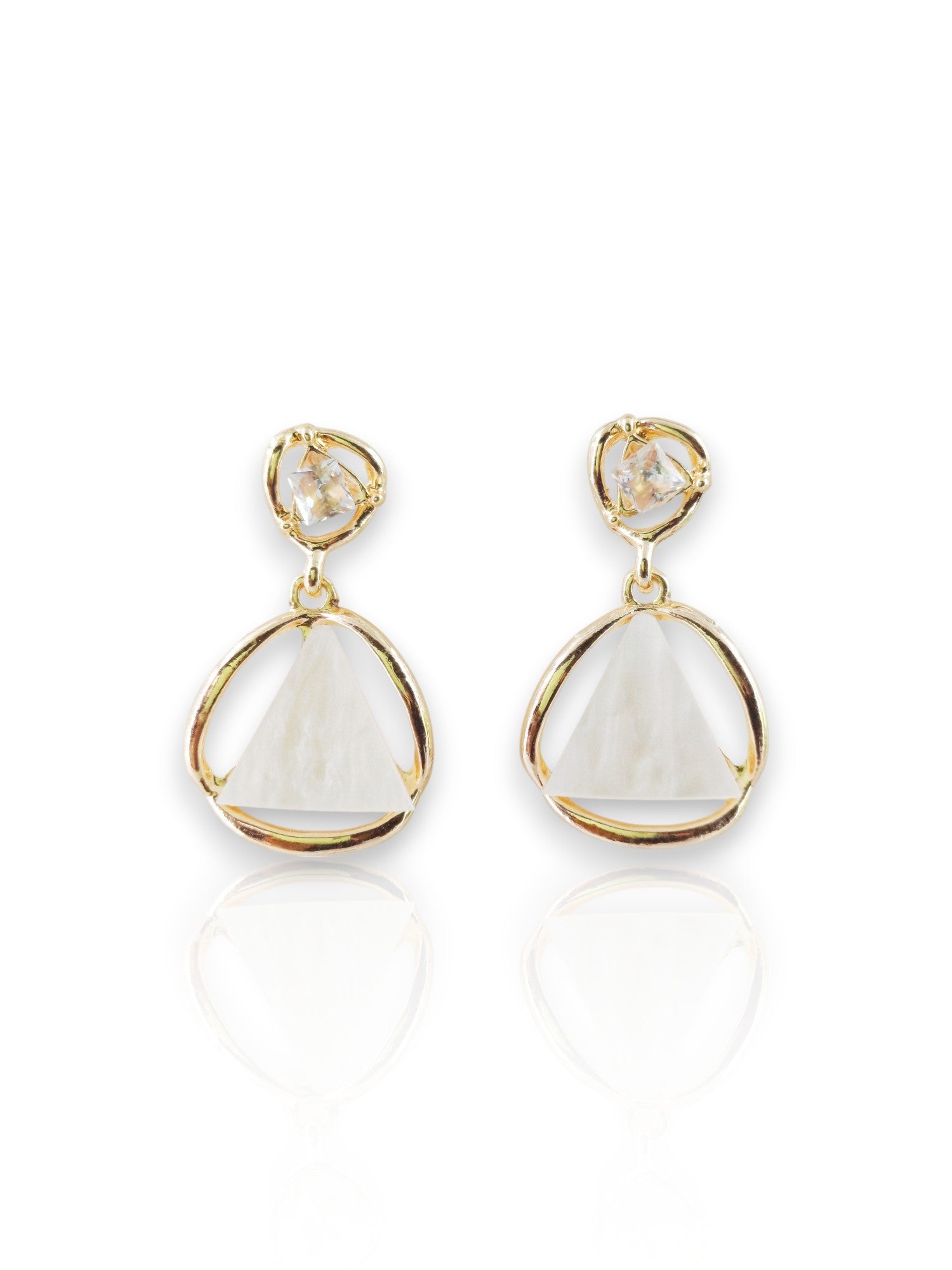 Modern and minimal, these geometric earrings in white gold plating feature a triangular mother-of-pearl drop framed in an artistic, abstract setting. A square-cut stone tops it off for a chic, architectural look.