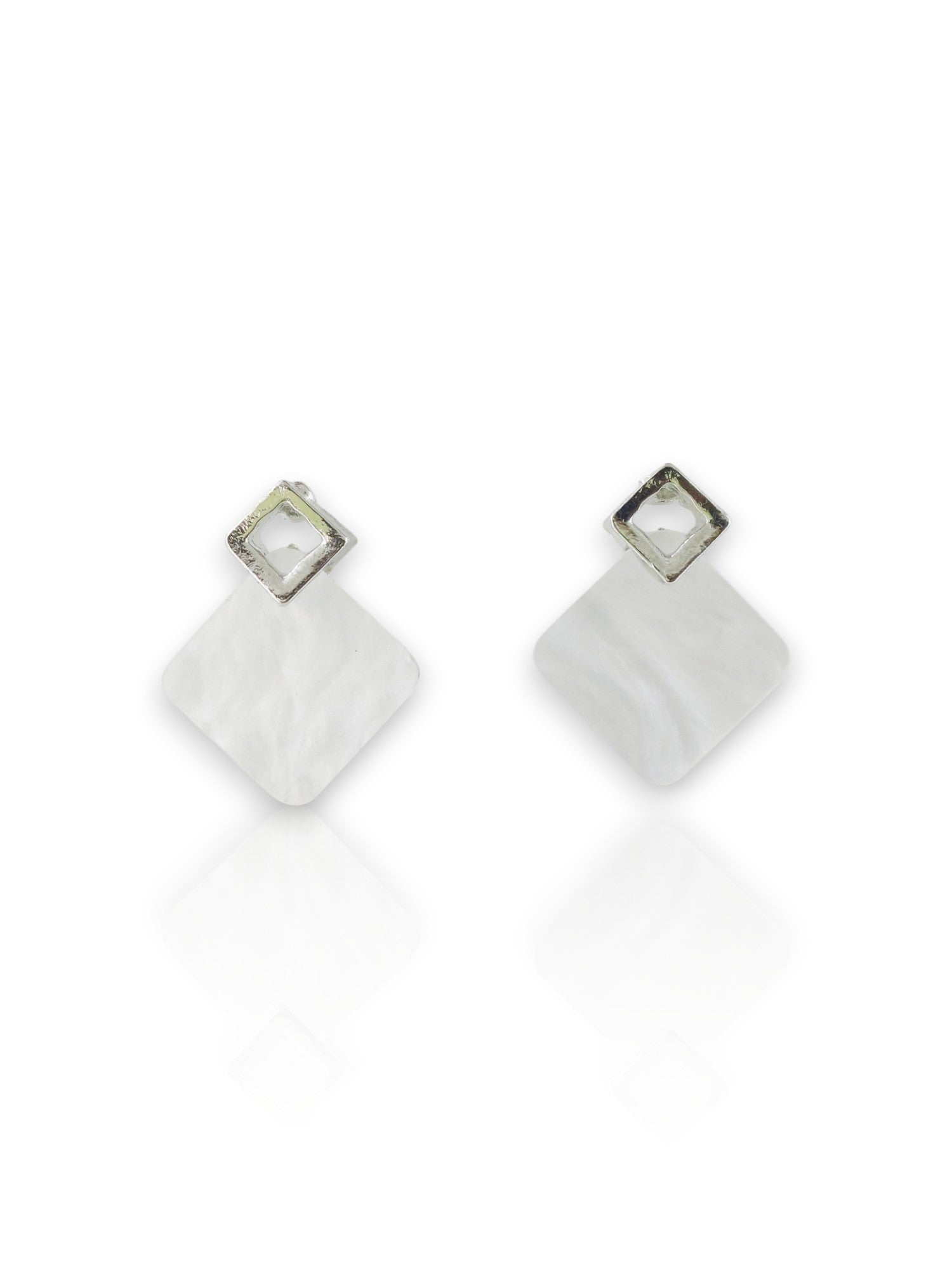 Make a statement with these modern diamond-shaped drop tops. The geometric open-frame stud holds a pearlescent square drop that catches the light beautifully. Perfect for those who love a chic and bold aesthetic, these earrings are available in both rose gold and white gold plating for a look that’s uniquely you.