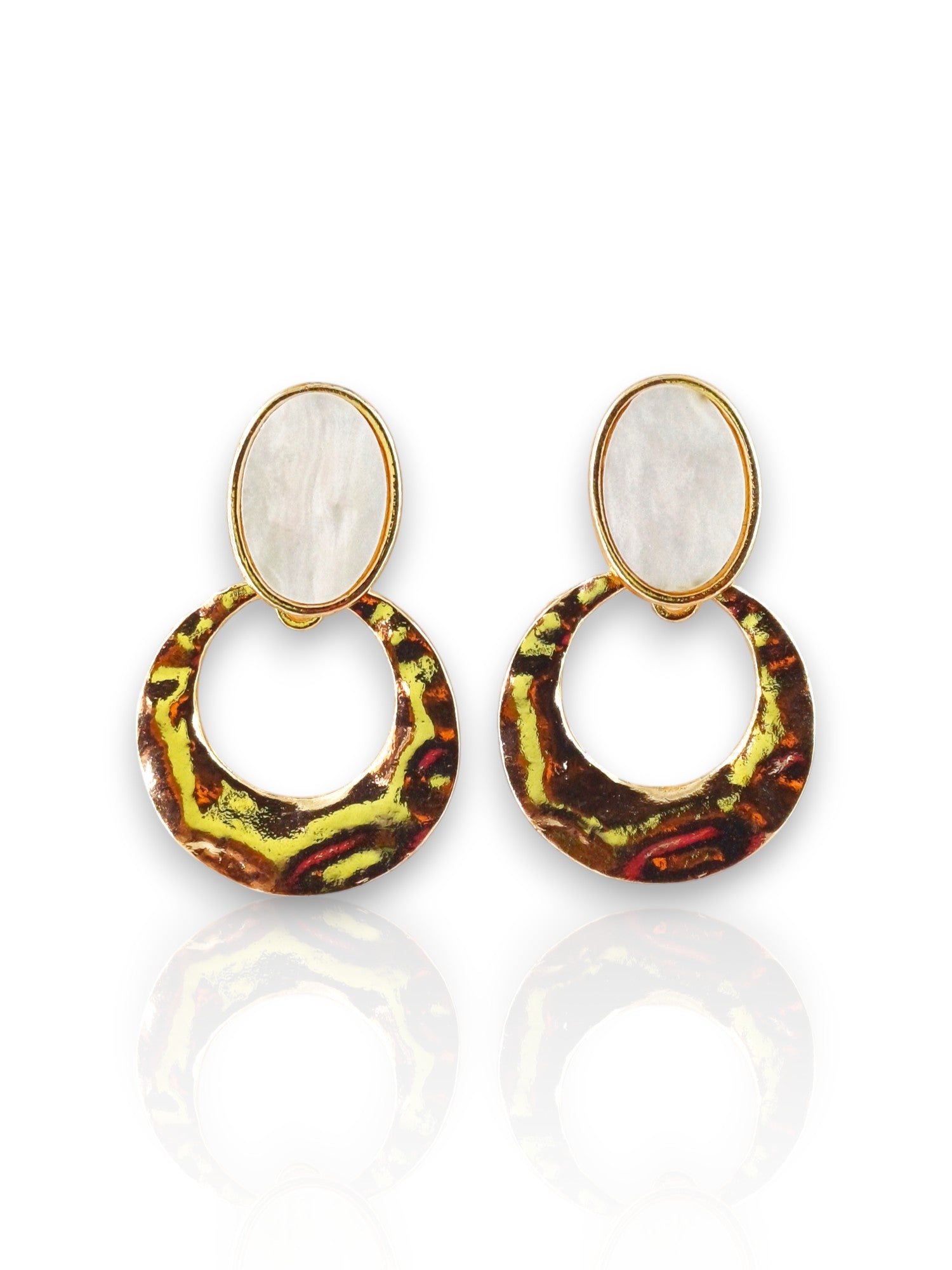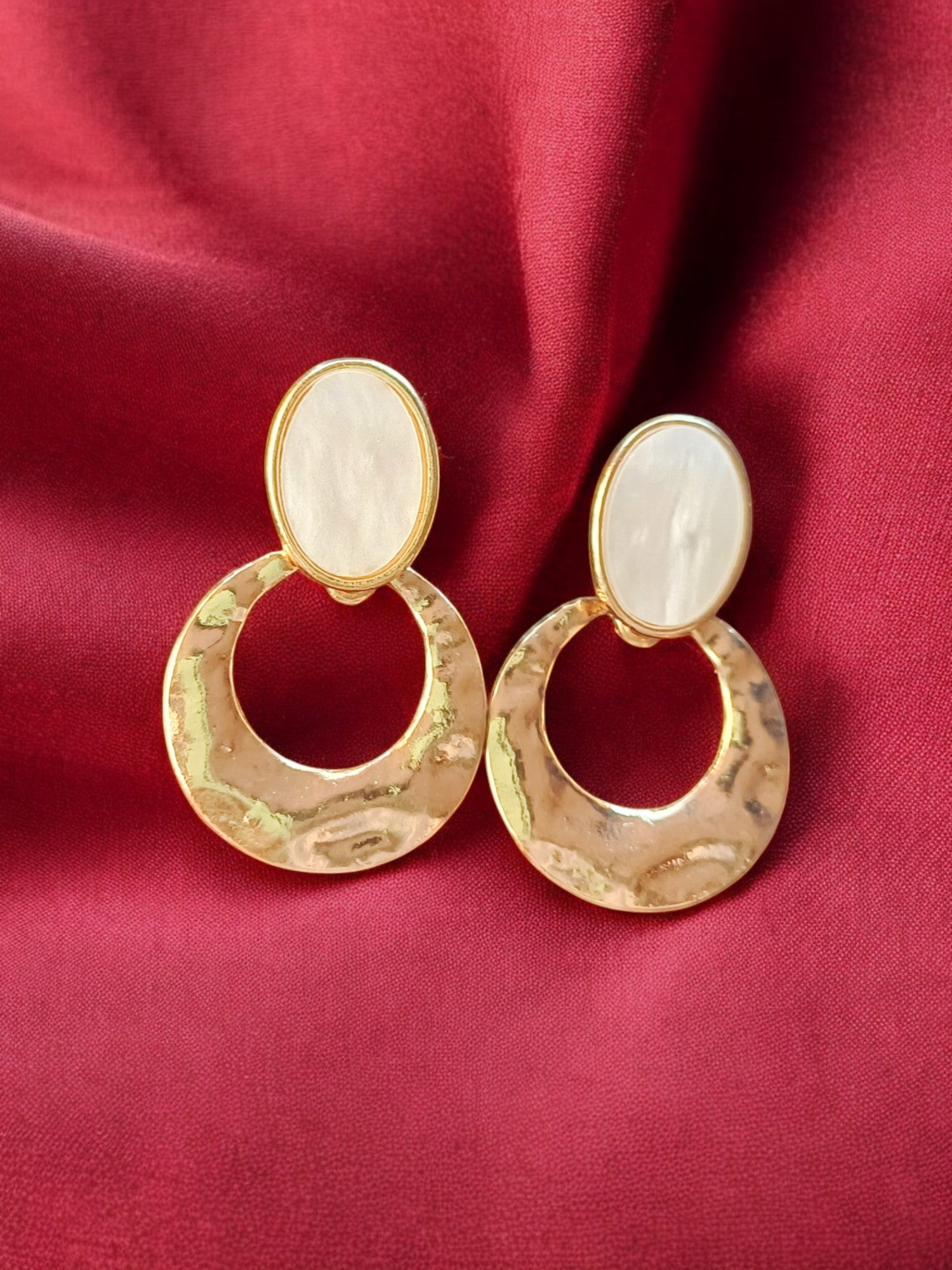 Make a statement with these artisanal-style earrings featuring an oval top and textured, rustic hammered rings. The blend of pearl-like shine and antique-finish ring creates a stunning contrast, offering a bold yet elegant accessory to elevate your look